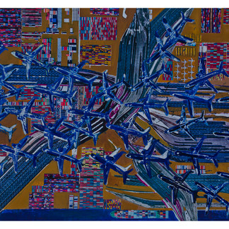 The “Commodities series” focuses on the transportation of these useful, valuable things; everyday products and objects across distances and borders. At the heart of the “Commodities” is the notion that high speed travel and transport networks have fundamentally changed the way humans relate to space and time, and that perceptions of distance between points in space have shortened. The artworks in “the Commodities” feature the symbols of contemporary long and short haul transport networks from land freight to maritime routes, airline systems and services. There are cargo ships, planes, trains and stationary goods in containers awaiting collection; visual symbols of objects and people in continuous motion across very busy international spaces actively participating in the evolving process of globalisation.